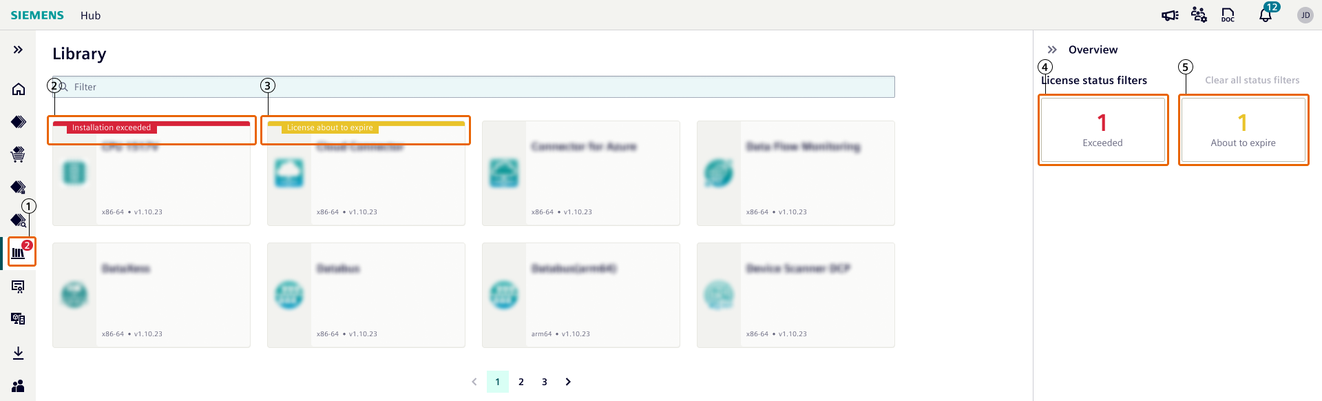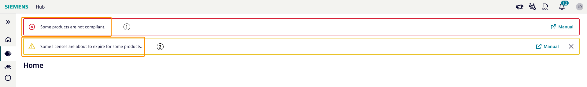 Industrial Edge Hub shows compliance warnings if number of installations / onboarding / enablement is more than number of licenses assigned to Industrial Edge Management or Industrial Edge Device.